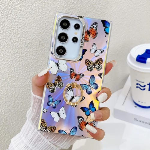 Estuche para Teléfono Samsung Galaxy S24 Ultra 5G con Soporte para Anillo Mariposa Láser con Galvanoplastia (Mariposas de Color Ab1)