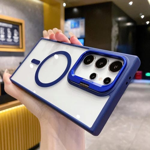 Estuche para teléfono Samsung Galaxy S24 Ultra 5G Magsafe con soporte de marco de lente de metal (Azul)