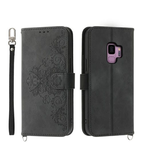 Funda para Teléfono Samsung Galaxy S9 Cuero con Billetera en Relieve y Flores (Negro)