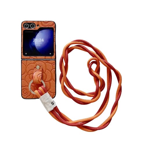 Funda Protectora Samsung Galaxy Z Flip5 5G Patrón Camelia con Cordón y Anillo Diamante (Naranja)