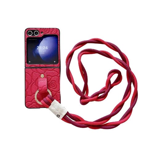 Funda Protectora Samsung Galaxy Z Flip5 5G con Patrón de Camelia, Cordón Largo y Anillo de Diamante (Rojo)