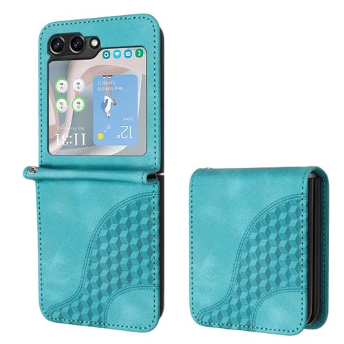 Funda para Samsung Galaxy Z Flip5 5G Yx0060 Cuero con Relieve y Cabeza de Elefante con Cordón (Azul Claro)