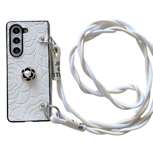 Funda Protectora Samsung Galaxy Z Fold5 5G con Patrón de Camelia y Cordón Largo (Blanco)