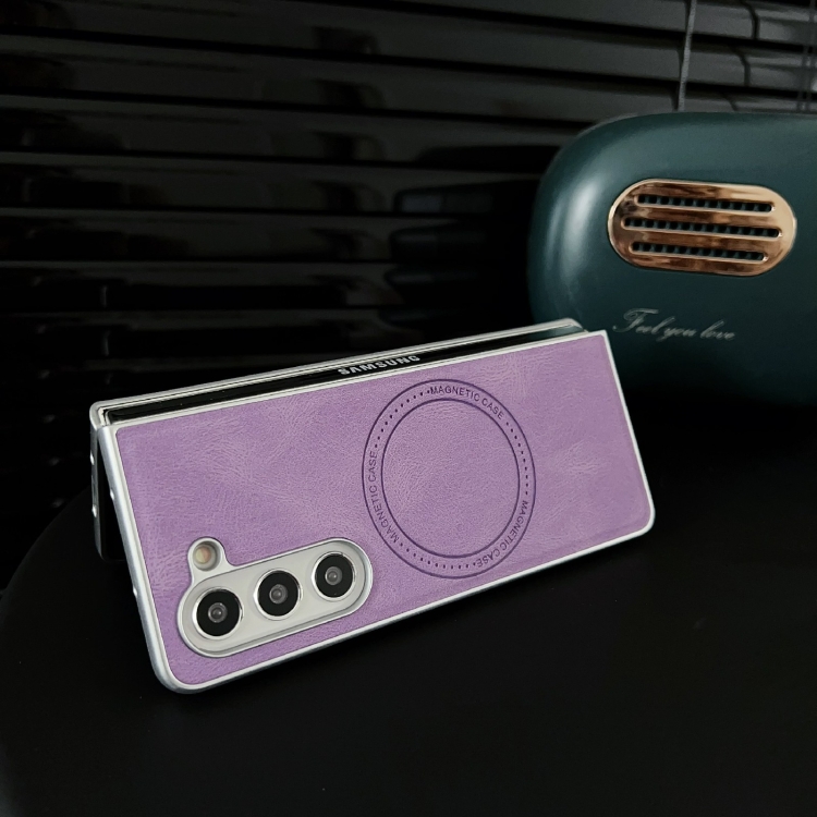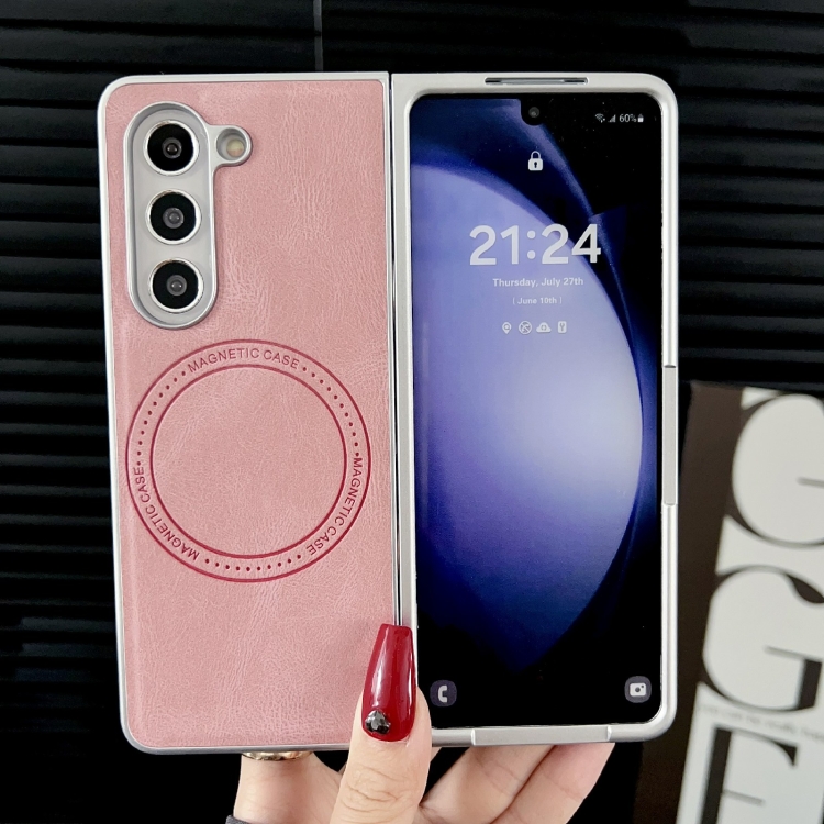 Funda para Teléfono Samsung Galaxy Z Fold5 Skin Feel Textura de Cuero Magsafe Pintura Nacarada a Prueba de Golpes (Rosa)