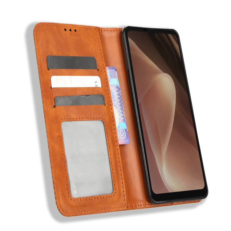 Funda de Cuero para Sharp Aquos Sense7 con Hebilla Magnética y Textura Retro (Marrón)