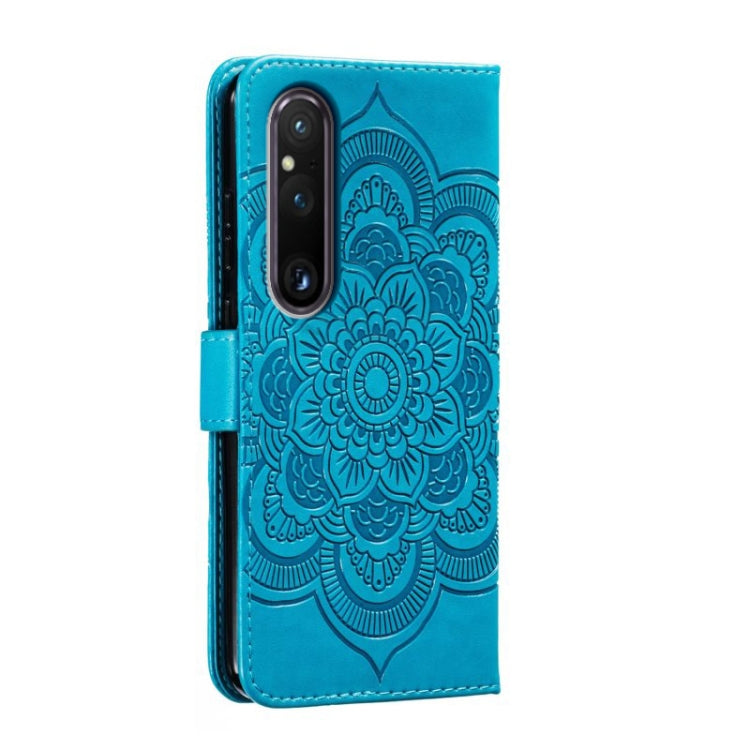 Funda de Cuero para Sony Xperia 1 V con Patrón Sun Mandala en Relieve (Azul)