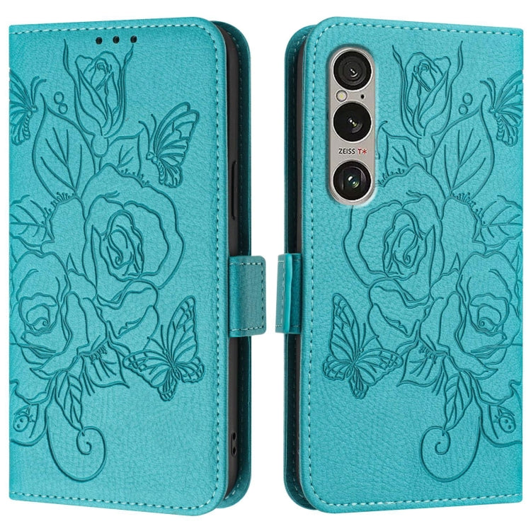 - 1x Funda de Cuero Antirrobo RFID para Sony Xperia 1 Vi con Rosa en Relieve (Azul Claro)