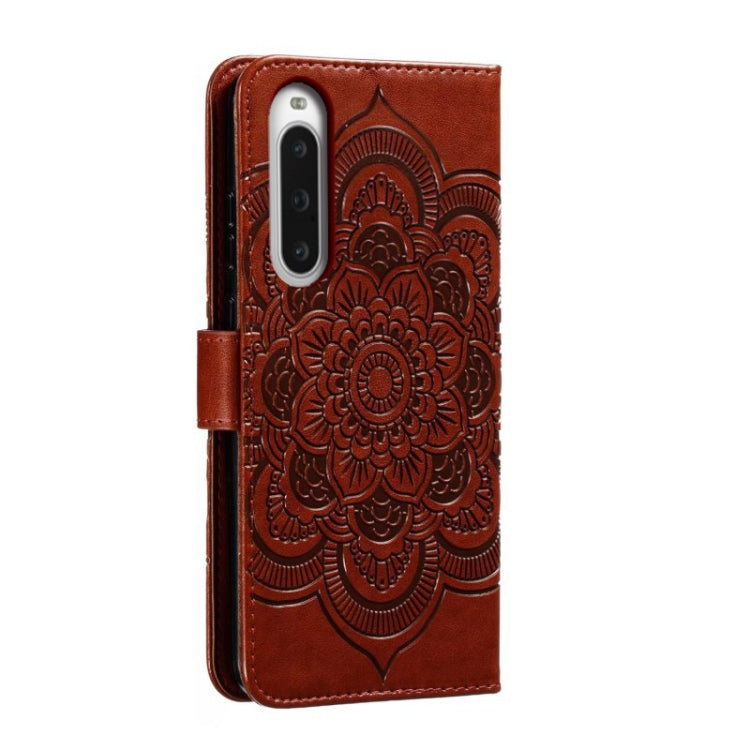 Funda de Cuero para Sony Xperia 10 V con Patrón en Relieve Sun Mandala (Marrón)