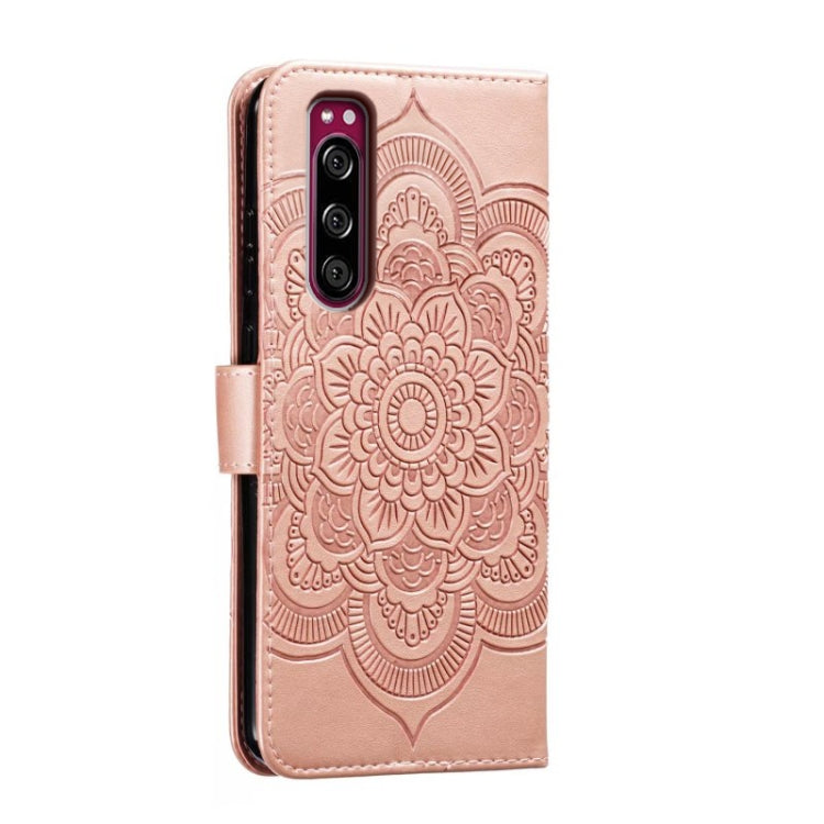 Funda de Cuero para Sony Xperia 5 con Patrón Sun Mandala en Relieve (Oro Rosa)