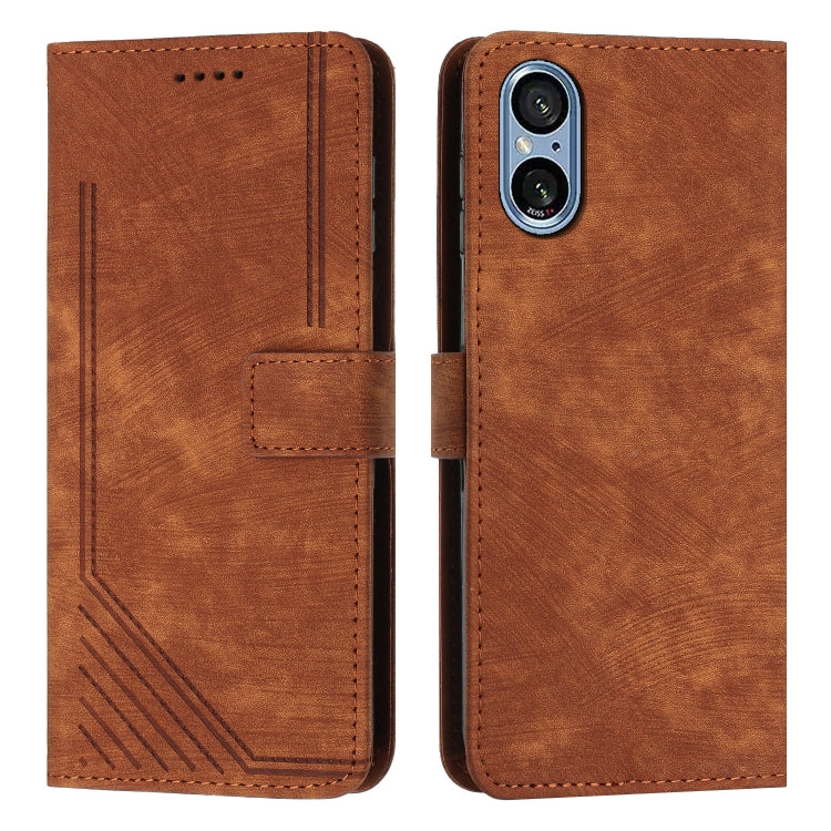 Funda de Cuero para Sony Xperia 5 V con Patrón de Rayas y Cordón (Marrón)