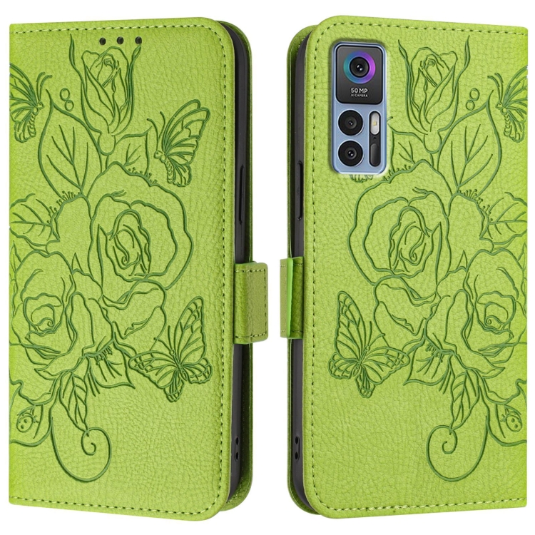 Funda de Cuero Antirrobo RFID para TCL 30 5G / 4G / 30+ con Rosa en Relieve (Verde)
