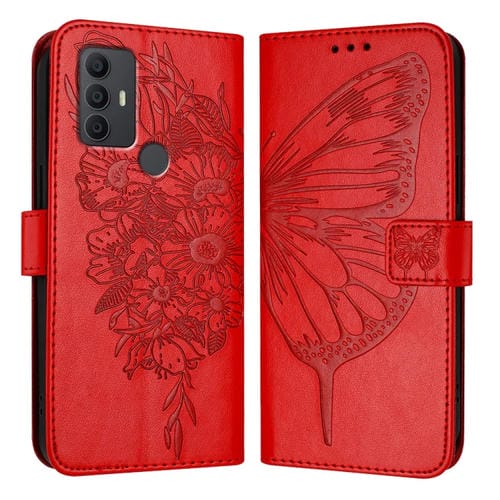Funda de cuero para TCL 306 con mariposa en relieve (Rojo)