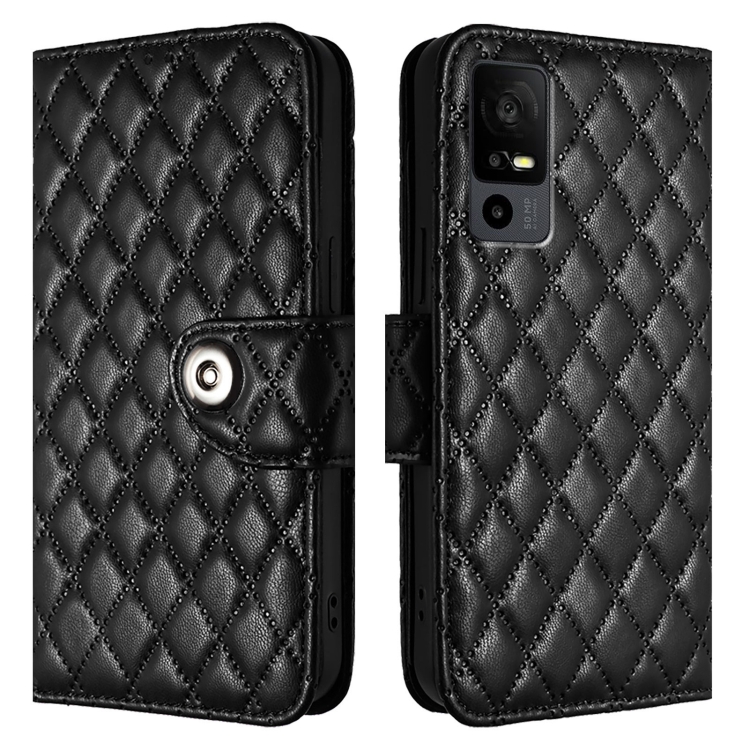 Funda para TCL 40 R 5G de Cuero con Tapa, Textura Romboidal y Cordón (Negro)