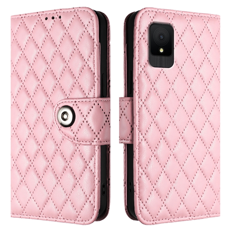 Funda para Teléfono TCL 502 de Cuero con Tapa Textura Romboidal y Cordón (Rosa)