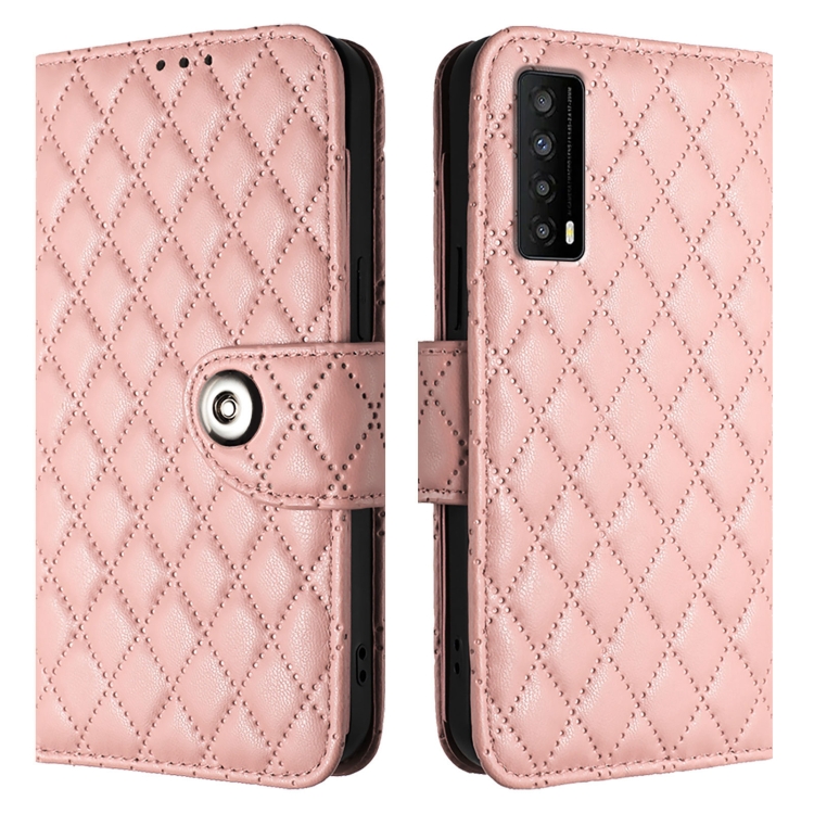 Funda para TCL Stylus 5G con Tapa de Cuero, Textura Romboidal y Cordón (Rosa Coral)