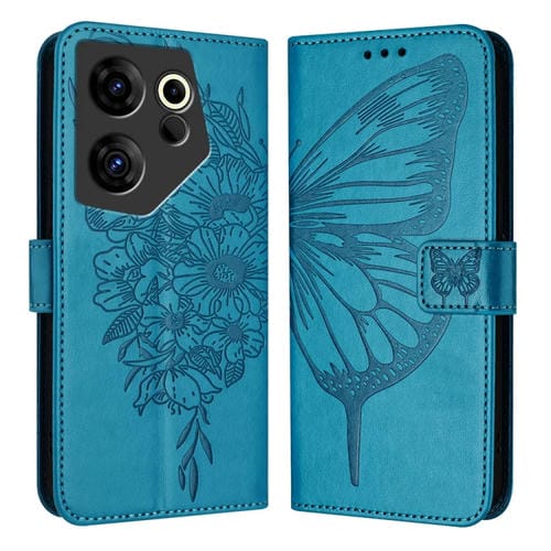 Funda de Cuero para Tecno Camon 20 Premier 5G con Mariposa en Relieve (Azul)