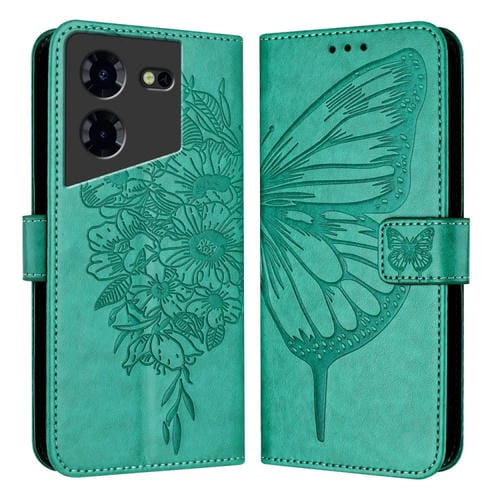 Funda de Cuero para Tecno Pova 5 Pro 5G con Mariposa en Relieve (Verde)