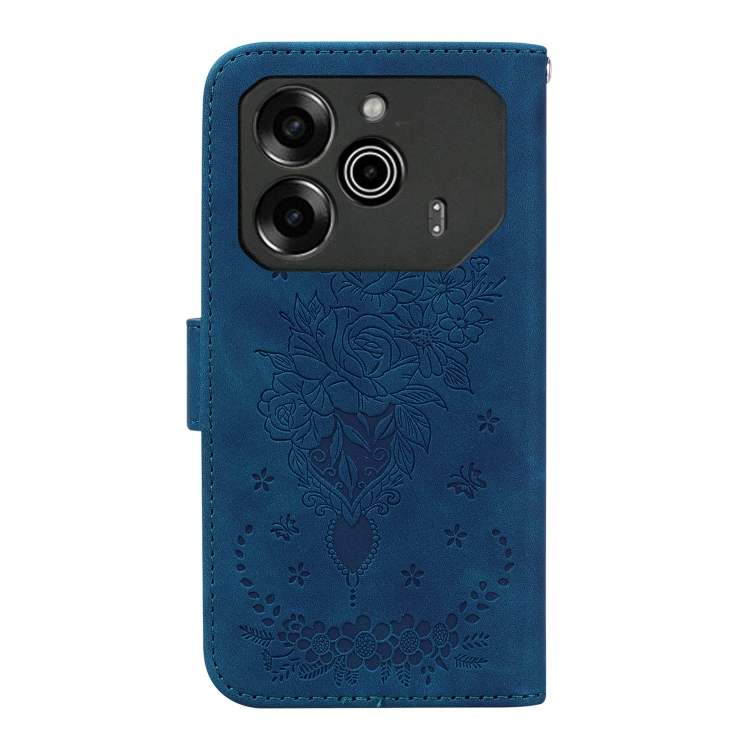 Funda para Tecno Pova 6 y Pova 6 Pro de Cuero con Relieve Mariposa y Rosa (Azul)