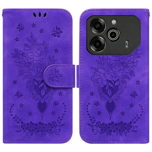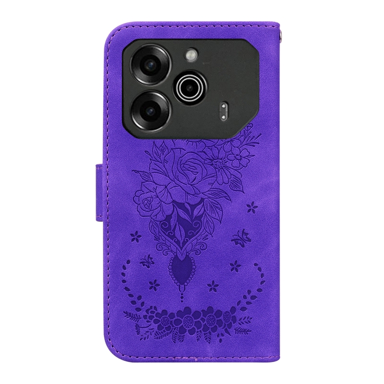 Funda para Tecno Pova 6 y Pova 6 Pro de Cuero con Relieve Mariposa y Rosa (Púrpura)