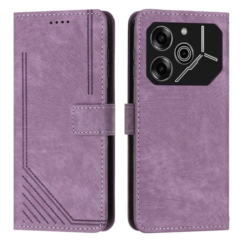 Funda de Cuero para Tecno Pova 6 Pro con Patrón de Rayas y Cordón Largo (Púrpura)
