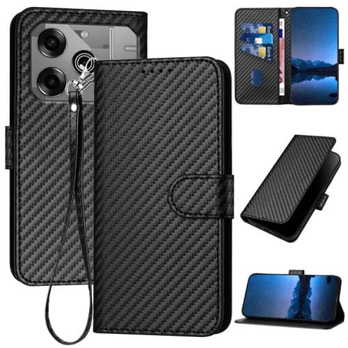 Funda de Cuero para Tecno Pova 6 Pro Yx0070 con Hebilla de Fibra de Carbono y Cordón (Negro)