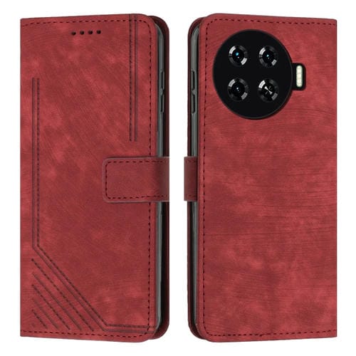 Funda de Cuero para Tecno Spark 20+ con Patrón de Rayas y Cordón Largo (Rojo)