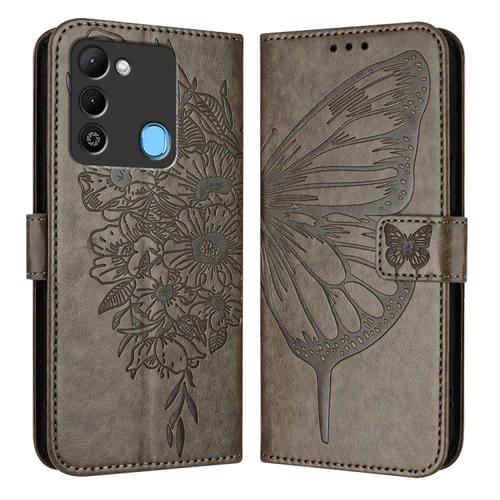 Funda de Cuero para Tecno Spark 9 con Mariposa en Relieve (Gris)