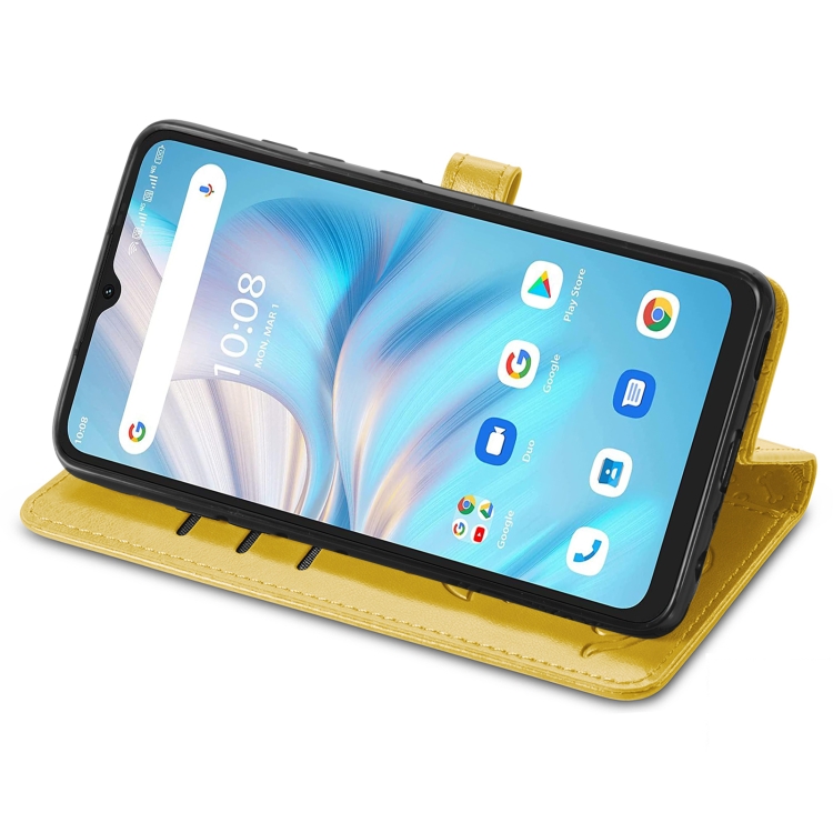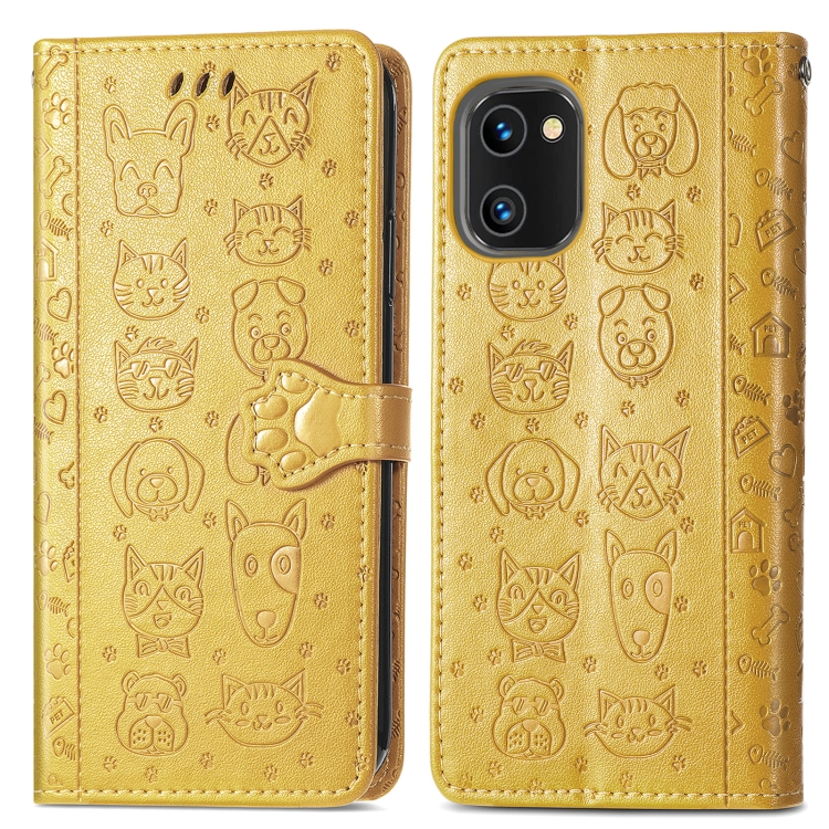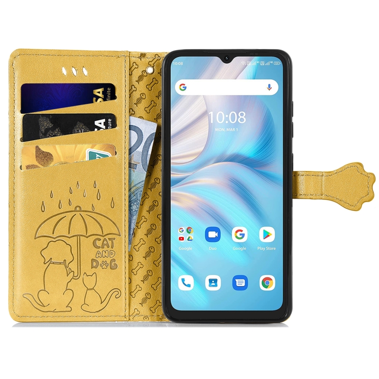Estuche de Cuero para Umidigi A13S Cute Cat And Dog con Relieve (Amarillo)
