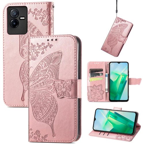 Para Vivo T2X 5G Butterfly Love Flower Estuche para Teléfono de Cuero En Relieve (Oro Rosa)