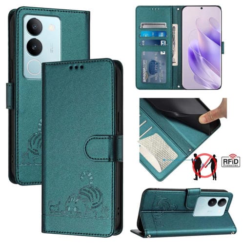 Para Vivo V29 5G Global / V29 Pro Cat Rat Estuche para Teléfono de Cuero Rfid con Patrón En Relieve y Cordón (Verde Pavo Real)
