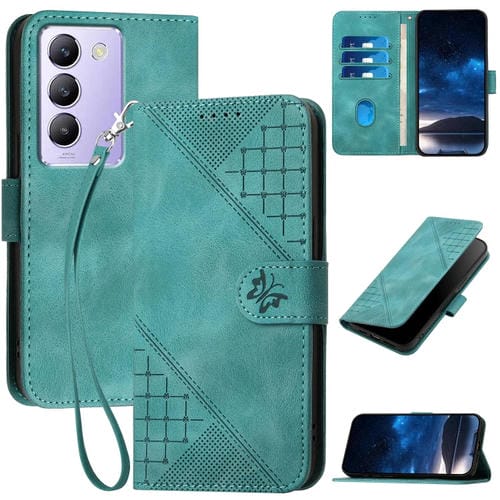 Para Vivo V30 Lite 5G India Yx0080 Funda de Cuero con Tapa con Patrón En Relieve de Mariposa y Cuadrícula con Cordón (Azul Claro)