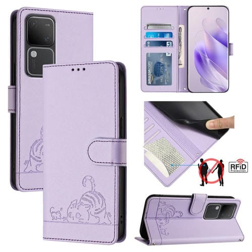 Para Vivo V30 Pro 5G Global Cat Rat Estuche para Teléfono de Cuero Rfid con Patrón En Relieve y Cordón (Púrpura)