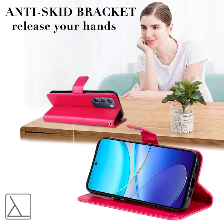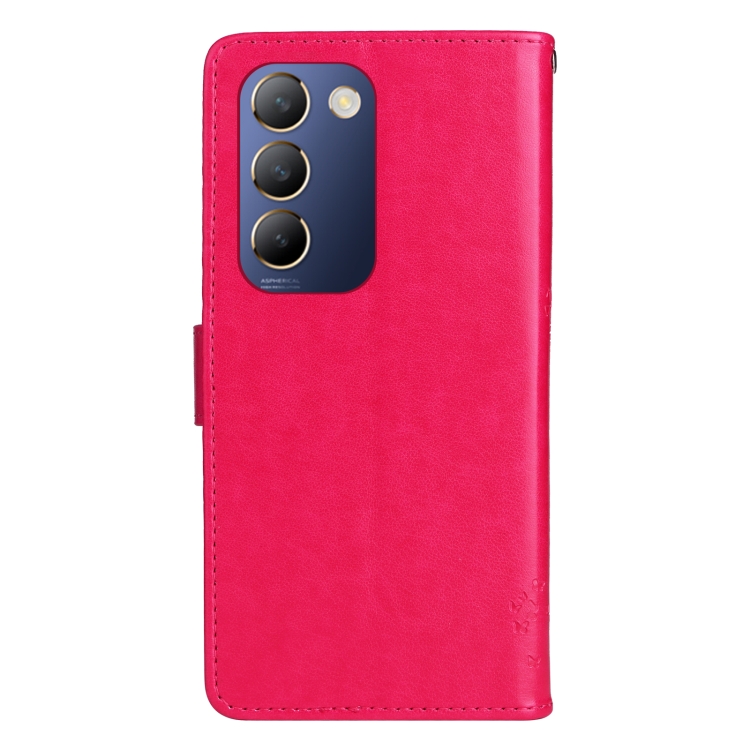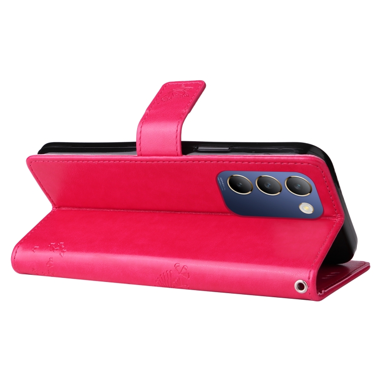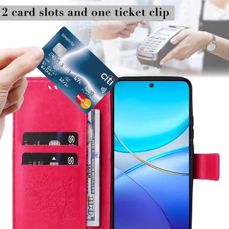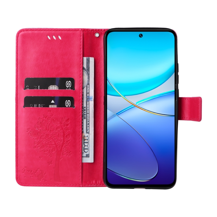 Para Vivo V40 Se 5G / Y100 Idn Funda para Teléfono de Cuero con Tapa con Patrón En Relieve de Árbol y Gato (Rojo Rosa)