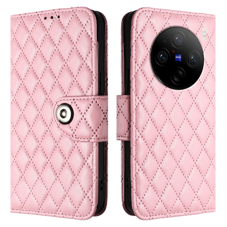 Para Vivo X100 Pro Funda de Cuero con Tapa con Textura Rómbica y Cordón (Rosa)