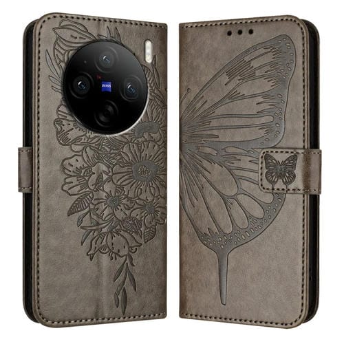 Para Vivo X100S 5G Funda de Cuero con Mariposa En Relieve (Gris)