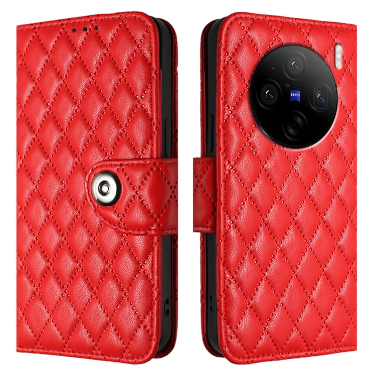 Para Vivo X100S Funda para Teléfono de Cuero con Tapa con Textura Rómbica y Cordón (Rojo)