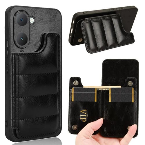 Para Vivo Y03 4G Funda para Teléfono con Bolsa para Tarjetas de Costura con Patrón de Vaca (Negro)