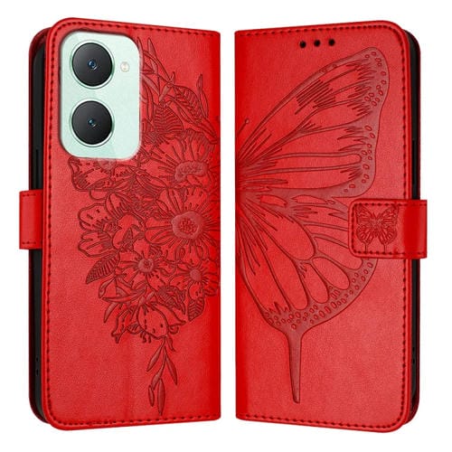 Para Vivo Y03 4G Funda para Teléfono de Cuero con Mariposa En Relieve Global (Rojo)