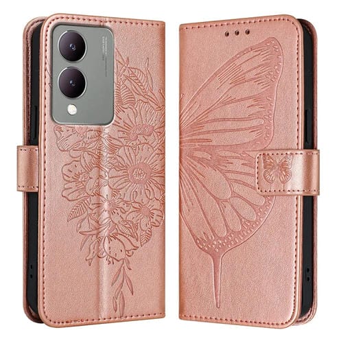 Para Vivo Y17S 4G Global / Y28 5G India Funda para Teléfono de Cuero con Mariposa En Relieve (Oro Rosa)