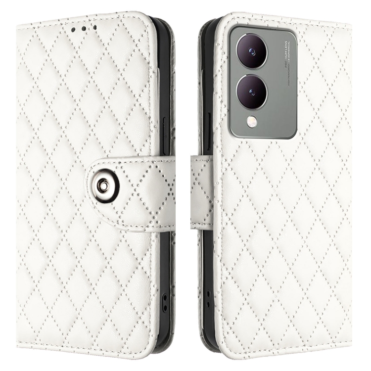 Para Vivo Y17S 4G / Y17S 5G India Funda para Teléfono con Tapa de Cuero con Textura Rómbica y Cordón (Blanco)