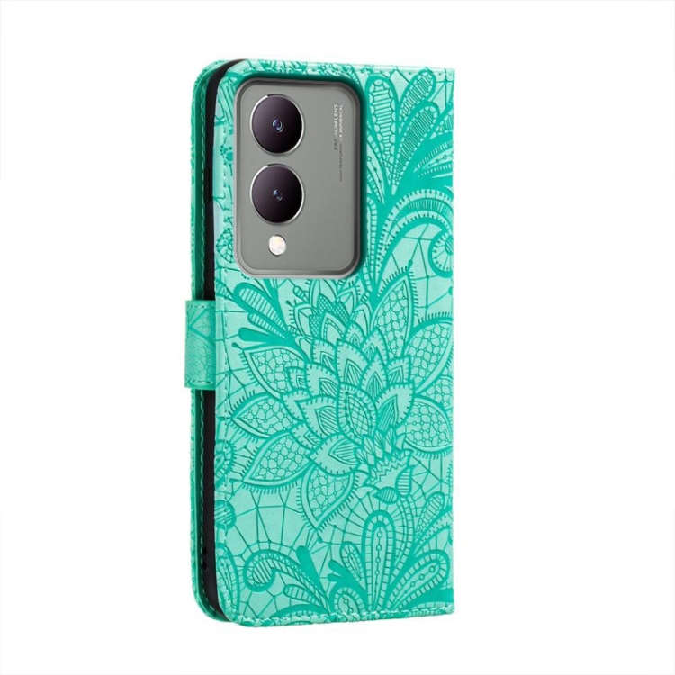 Para Vivo Y17S Funda para Teléfono de Cuero con Tapa y Estampado de Flores de Encaje (Verde)