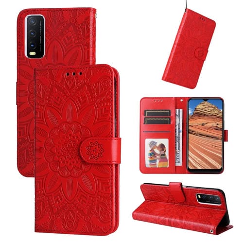 Para Vivo Y20 Estuche para Teléfono de Cuero con Estampado de Girasol En Relieve (Rojo)
