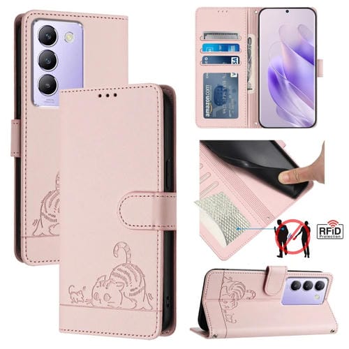 Para Vivo Y200E 5G Global Cat Rat Estuche para Teléfono de Cuero Rfid con Patrón En Relieve y Cordón (Rosa)