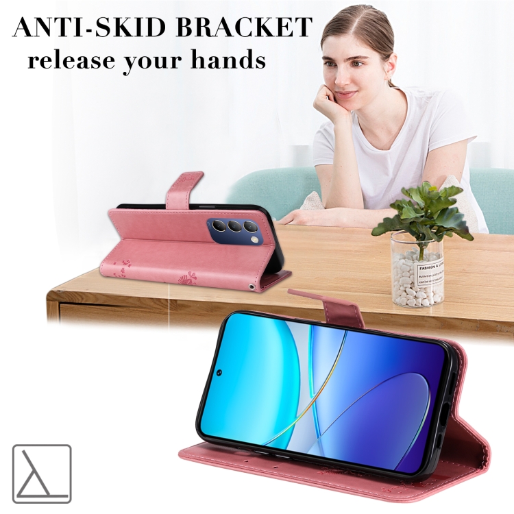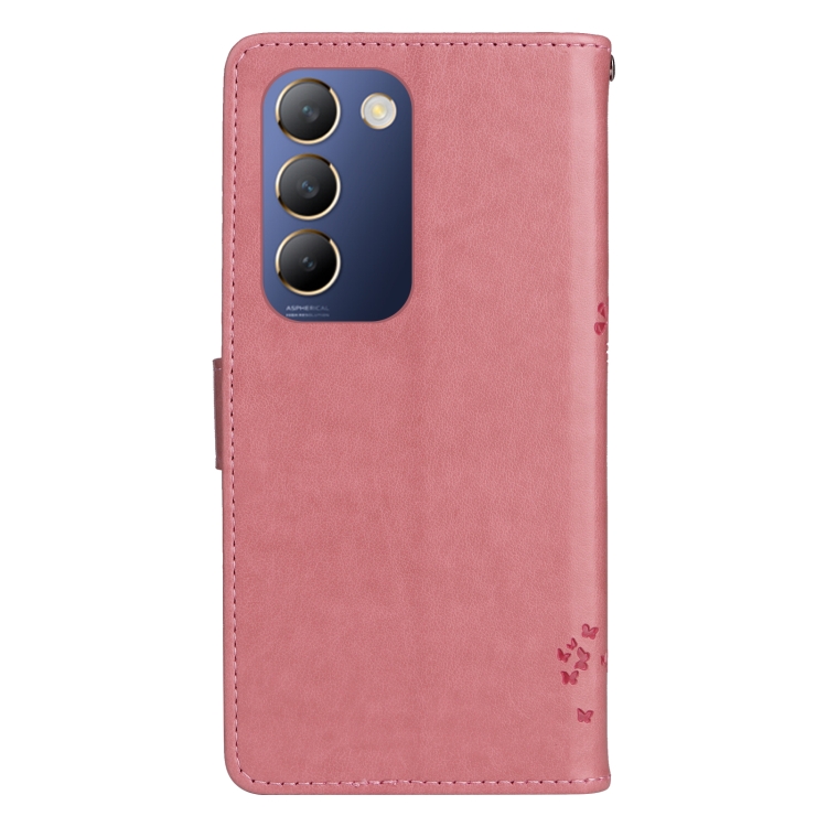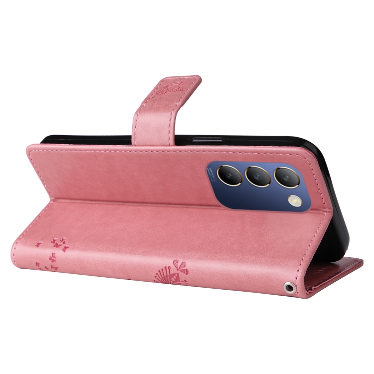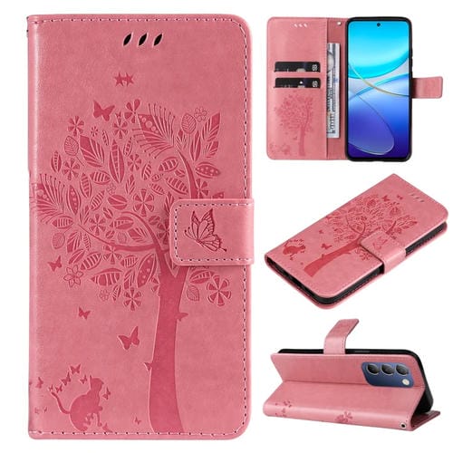 Para Vivo Y200E 5G Global / V30 Lite India Tree & Cat Funda de Cuero con Tapa con Patrón En Relieve (Rosa)