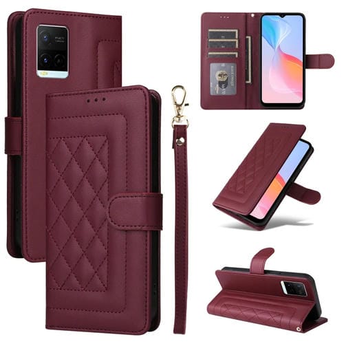Para Vivo Y21 / Y33S Funda para Teléfono con Tapa de Cuero Diamond Lattice (Rojo Vino)