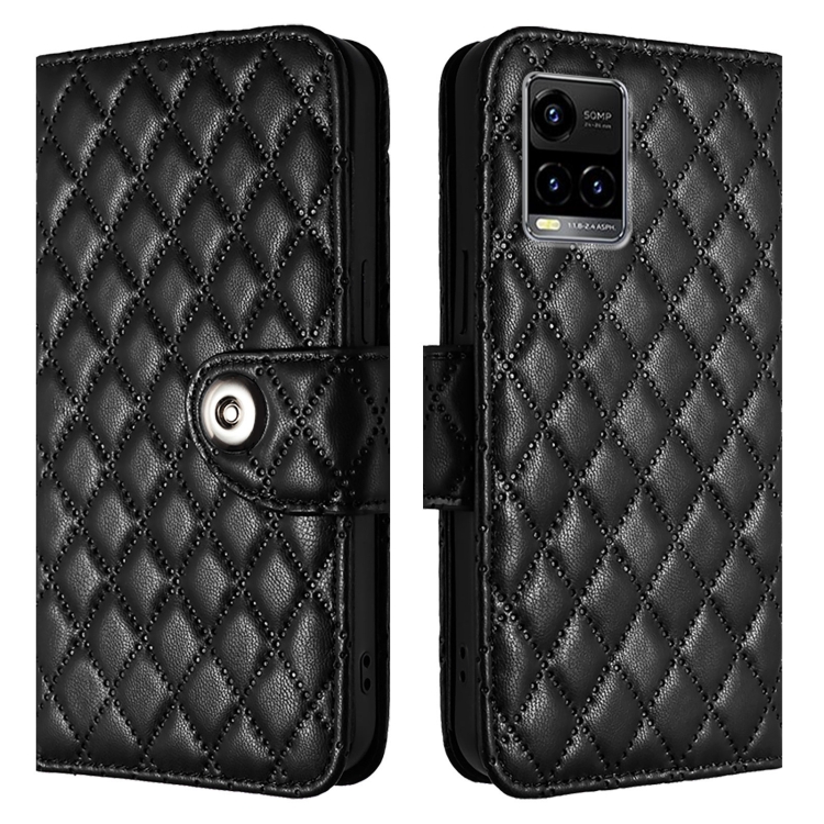 Para Vivo Y33S 4G / Y21 2021 / Y21S Funda para Teléfono con Tapa de Cuero con Textura Rómbica y Cordón (Negro)