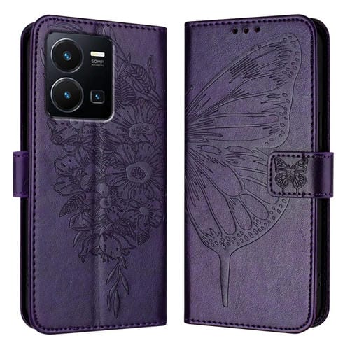 Para Vivo Y35 4G / Y22 4G / Y22S 4G Funda para Teléfono de Cuero con Mariposa En Relieve Global (Púrpura Oscuro)