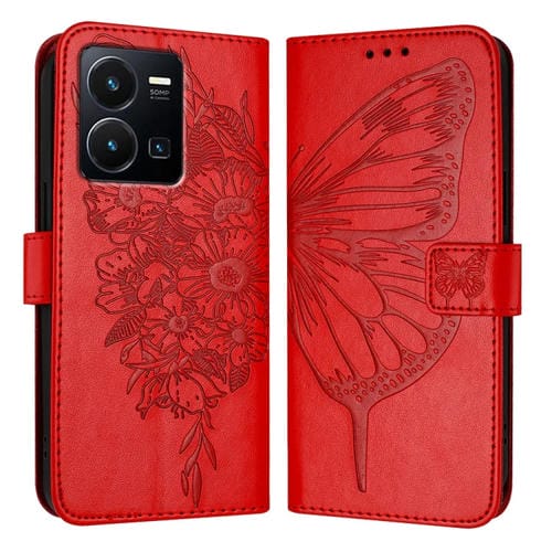 Para Vivo Y35 4G / Y22 4G / Y22S 4G Funda para Teléfono de Cuero con Mariposa En Relieve Global (Rojo)