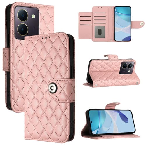 Para Vivo Y36 5G / Y36 4G / Y36 India Funda de Cuero con Tapa con Textura Rómbica y Cordón (Rosa Coral)