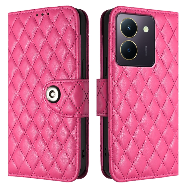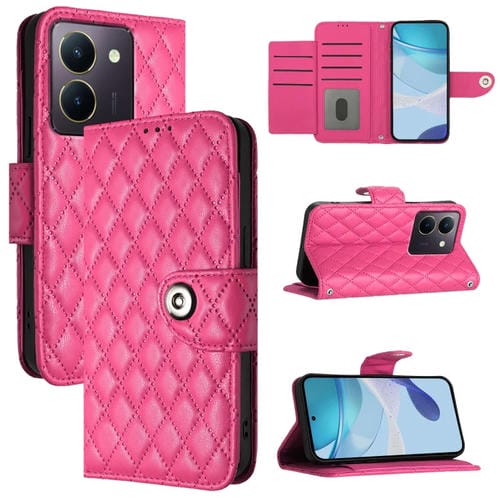 Para Vivo Y36 5G / Y36 4G / Y36 India Funda para Teléfono con Tapa de Cuero con Textura Rómbica y Cordón (Rojo Rosa)